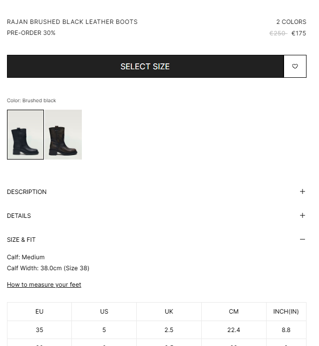 - Ancho de caña (cuando esté disponible): se muestra para la talla EU 38. Ten en cuenta una variación aproximada de ±4 mm por cada talla completa arriba o abajo.
